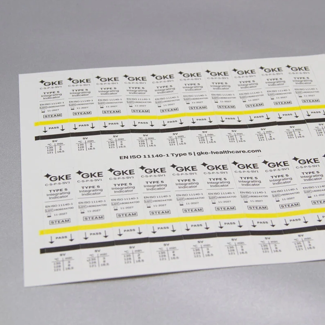 Indicador integrador autoadesivo GKE conforme EN ISO 11140-1 tipo 5 utilizado em embalagens e recipientes para processos de esterilização a vapor.